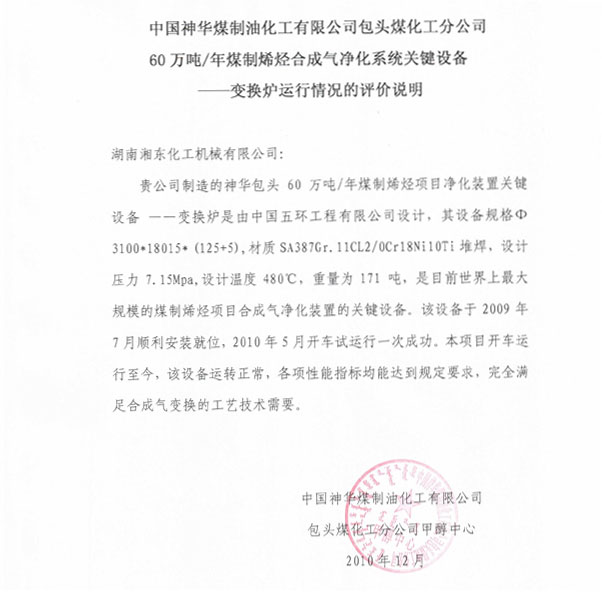 近日,中國(guó)神華煤制油化工有限公司包頭煤化工分公司甲醇中心在對(duì)我公司發(fā)來(lái)的賀信中說(shuō)到: