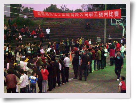 當(dāng)天晚上7點(diǎn),觀眾來(lái)到湘東化機(jī)生活區(qū)的燈光藍(lán)球場(chǎng)時(shí),只見黑壓壓一片人群將賽場(chǎng)圍得水泄不通,哇,好熱鬧,“加油、加油、加油。。。。。!保(duì)的助威聲震天響,整個(gè)比賽氣氛一再被推向高潮。8個(gè)隊(duì)120名職工在比賽場(chǎng)上進(jìn)行激烈的角逐,隊(duì)員們的心就像那根拔河繩凝聚成一根繩,在領(lǐng)隊(duì)的精心組織下,在拉拉隊(duì)的助陣下,勁往一處使。經(jīng)過(guò)2個(gè)小時(shí)的初賽和決賽,汽輪機(jī)分會(huì)和機(jī)關(guān)分會(huì)分別奪取了冠、亞軍。