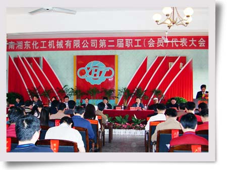 湖南湘東化工機(jī)械有限公司第二屆職工(會(huì)員)代表大會(huì)會(huì)場(chǎng) 湖南省經(jīng)貿(mào)委工會(huì)、株洲市總工會(huì)、攸縣總工會(huì)、湖南省網(wǎng)嶺監(jiān)獄工會(huì)、湖南省酒埠江電站、株洲市桃水煤礦、湖南化工機(jī)械學(xué)校等單位領(lǐng)導(dǎo)到會(huì)并致賀詞。